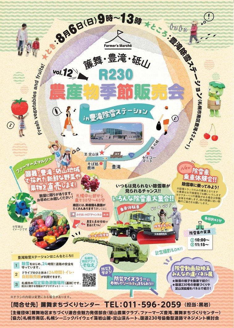 8月3日(日)、9時から豊滝除雪ステーション裏の除雪車両格納庫前の特設会場にて、簾舞の豊滝や砥山地区の農家さんの新鮮な野菜や果物の直売会を行います。