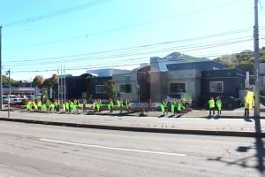 快晴の秋空の下、大谷南区長はじめ久門市民部長、中村総務企画課長、山谷南警察署第一課長他、多くの来賓の方々や簾舞小中学校、中定建設工業さん、酒出簾舞まち連会長、五十嵐会長をはじめとする地区交通安全運動推進委員会、交通安全母の会、交通安全指導員会等の地域の皆さん方67名の参加者によって国道を走る車両へ安全運転での呼びかけが行われました。