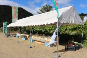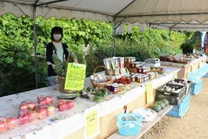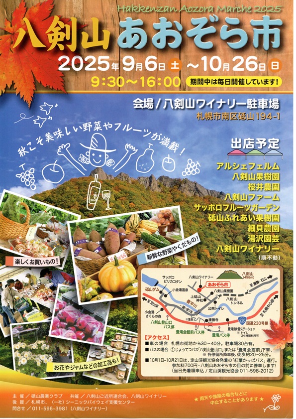 砥山農業クラブ主催、八剣山ご近所連合会、八剣山ワイナリー共催による、砥山や豊滝、簾舞の農家さん等による「八剣山あおぞら市」が、今年も八剣山ワイナリーの駐車場で9月6日(土)から10月26日(日)まで開催中です。