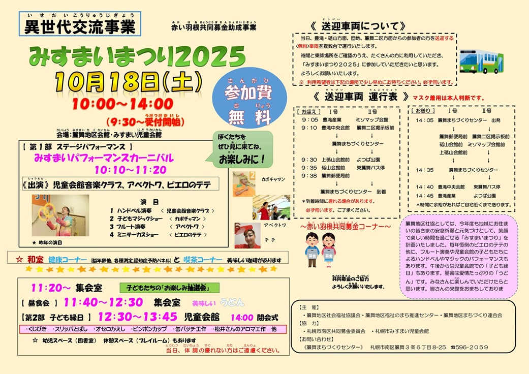 今年も10月15日(土)、簾舞地区会館とみすまい児童会館を会場に異世代交流事業の「みすまいまつり2025」を開催します。