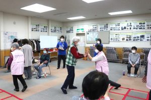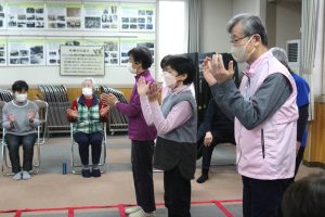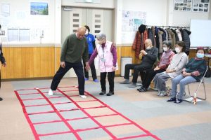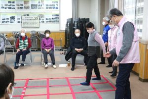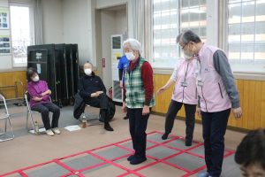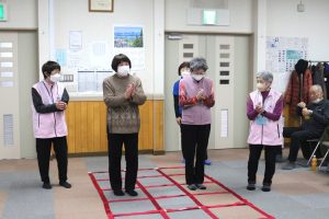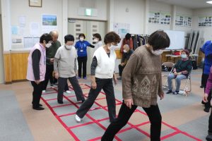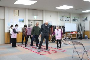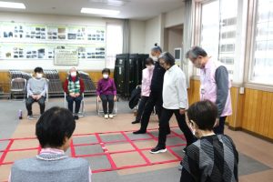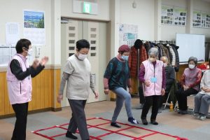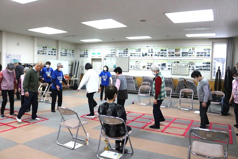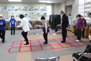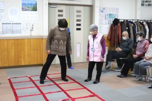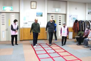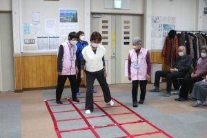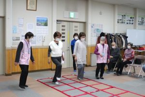 当日はNPO法人ふまねっと職員とふまねっとインストラクター・サポーターの皆さんの指導の下に、「ふまねっと」についての説明を受けた後、準備運動、そしてサポーターのお手本を見ながら参加者は一つずつ段階を上げて運動をしました。