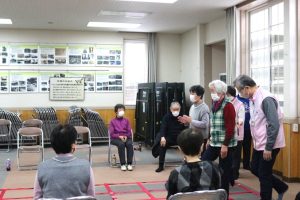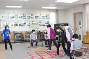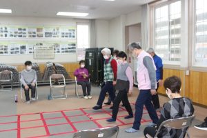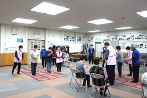 研修内容は、簾舞地区まちづくり連合会福祉部会との共催での、NPO法人ふまねっとによる介護予防運動プログラム「ふまねっと」で、約50cm四方のマス目でできた大きなアミを床に敷いて、そのアミを踏まないように歩くという運動です。