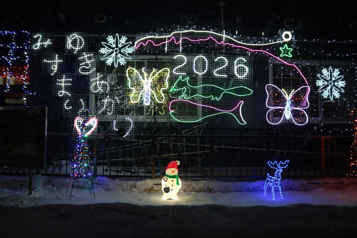 1/19 「雪あかりイルミネーション」ヴァージョンアップ中 ニュース X Facebook はてブ LINE コピー 2026.01.20令和8年2月7日(土)の「みすまい雪あかり2026」の点灯式に向けてイルミネーション装飾がヴァージョンアップ中です。デザインは会館管理人の中野さんです。 夕方 16:00~19:30まで自動点灯されています。 昨年のイルミネーション