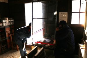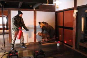 今回は南消防署員と簾舞通行屋保存会会員だけによる小規模な消防訓練で、旧黒岩家住宅内のいろりから出火という想定での訓練でした。