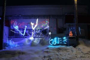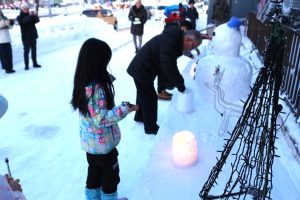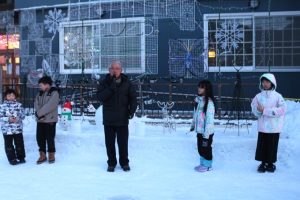 酒出まち連会長からの挨拶後、児童会館の子ども代表とアイスキャンドルに点灯、引き続いて五十嵐まち連副会長や児童会館、その他の子ども達、保護者や地域の方々らも交えて他のアイスキャンドルに点灯しました。そしてイルミネーションのデザインを担当した会館管理人から説明がありました。