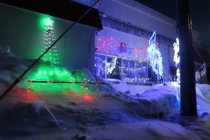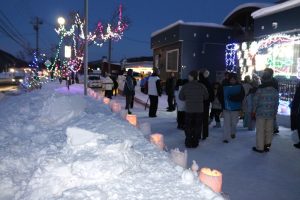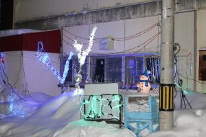 豊滝中央町内会の会館前と簾舞団地のミソマップ会館前でもイルミネーションが点灯されています。当日、イルミネーションの点灯式が行われたミソマップ会館では会館隣でスノーフェスティバルも開催され、子どもたちも滑り台などで楽しみました。