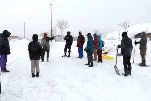 当日は予報通りの吹雪状態という悪天候。集合した時にも風が強かったので、歩くコースを多少短くして、休憩場所もいつもの丘上の四阿(あずまや)ではなく、平地のビジターセンター側の休憩所に変更しました。