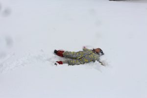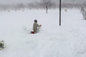 天気が良ければ遠くに見える百松沢山、神威岳、烏帽子岳も吹雪のため、全く見えなかったのですが、そんななかでも子どもは元気いっぱい。