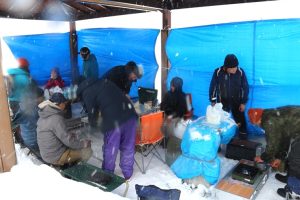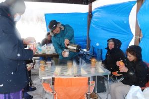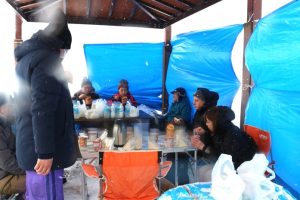 休憩所設営の3人を除いた10人で丘上の鐘まで歩きました。そして、風よけ等を設営したピクニック広場の休憩場所まで戻り、温かなスープとサンドウィッチでのもぐもぐタイムでひとときを過ごしました。