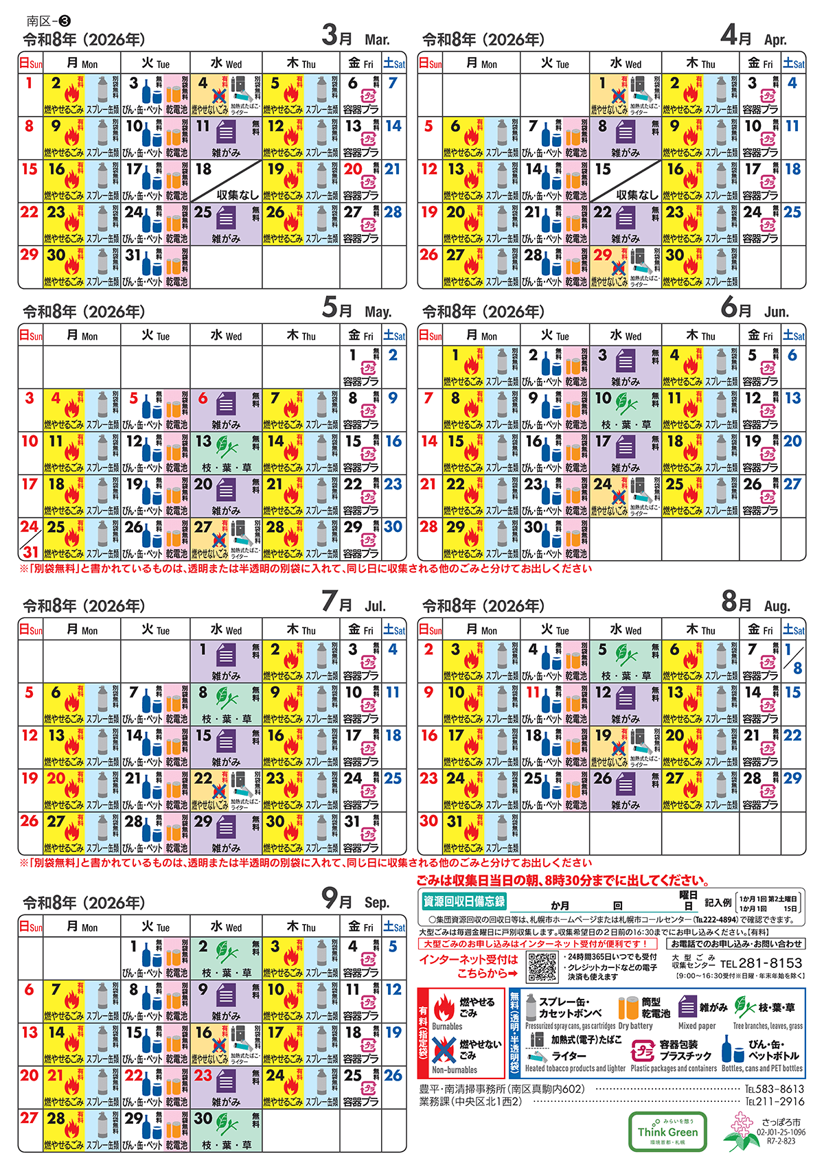 HOME > ゴミカレンダー ゴミカレンダー 札幌市発行ゴミカレンダー(南区3) 2025年9月~2026年9月 藤野○条○丁目、○番地 白川○番地 簾舞○条○丁目、○番地 砥山○番地 豊滝○番地 硬石山○番地 小金湯○番地 定山渓温泉西・東の○丁目 定山渓○番地 画像をクリックすると札幌市のサイトへ